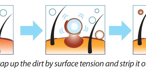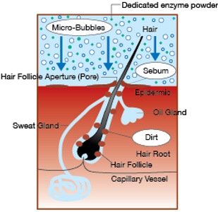 The size of a pore is 30μ and the size of a microbubble is smaller.. at 20μ.. so can easily penetrate deep down inside the pore. The microbubbles are just water and air, so we add Toji enzyme powder to eat away at the sebum crust, breaking it down and making it softer. In turn, the broken-down sebum will be removed by the microbubbles as they travel deep into the pore, effectively cleaning it out completely.